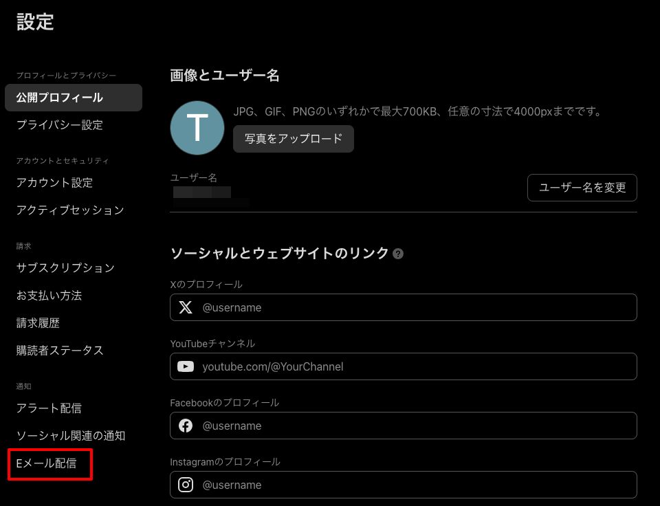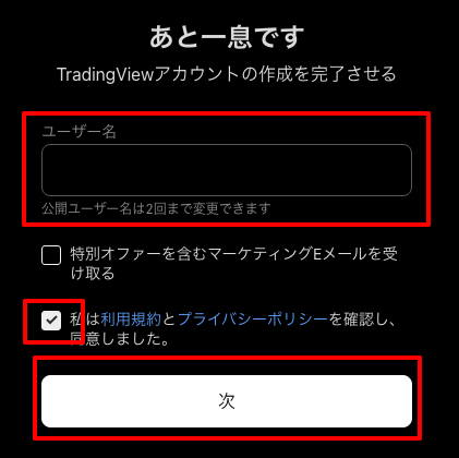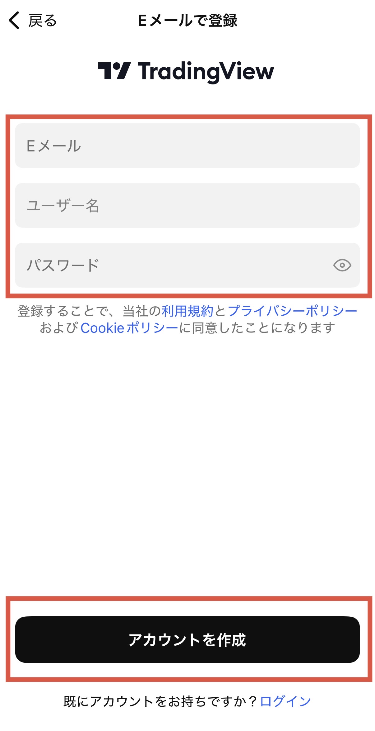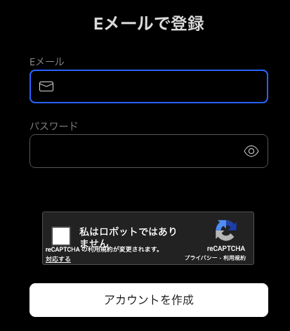 Eメールの入力欄に普段お使いの「メールアドレス」と「ユーザー名」、「任意のパスワード」を入力します。パスワードは忘れないように管理しましょう。