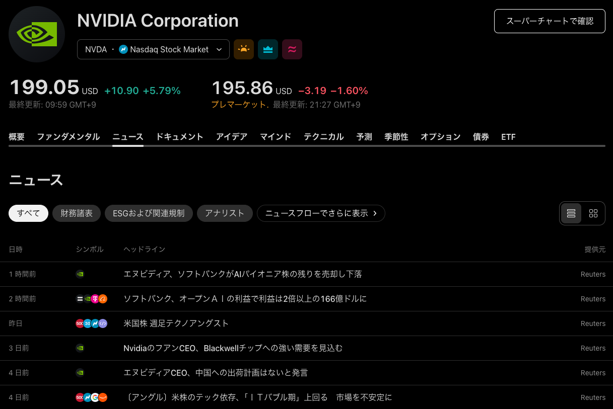 米国株(例:Apple、Amazon)はもちろん、新しく上場した小型株まで表示可能です。もちろん、日本株も同様にチェックできます。