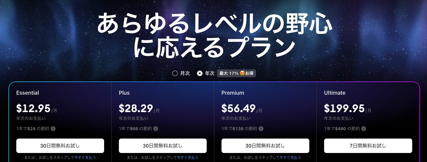 無料プランの「Basic」と有料プランの「Essential/Plus/Premium/Ultimate」の料金プランは次の通りです。