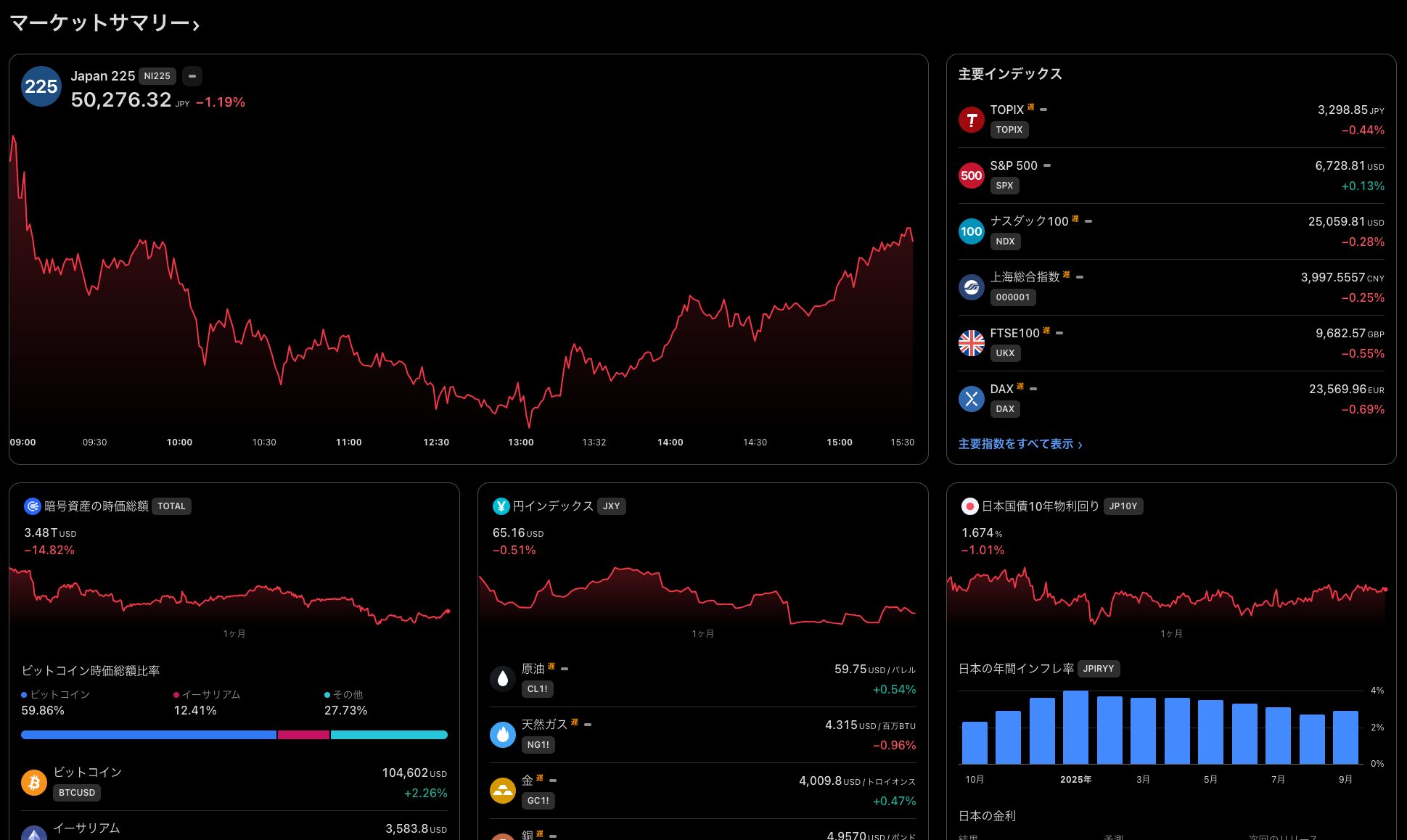 さらに、世界中の株価指数(日経平均・S&P500・ダウ平均)、為替(ドル/円、ユーロ/ドル、ポンド/ドルなど)、金利(米10年債利回り、日本10年債利回り、政策金利)、コモディティ(金・原油など)、そして仮想通貨(ビットコインなど)等の数多くのチャートを、1つの画面で横断して確認することができます。