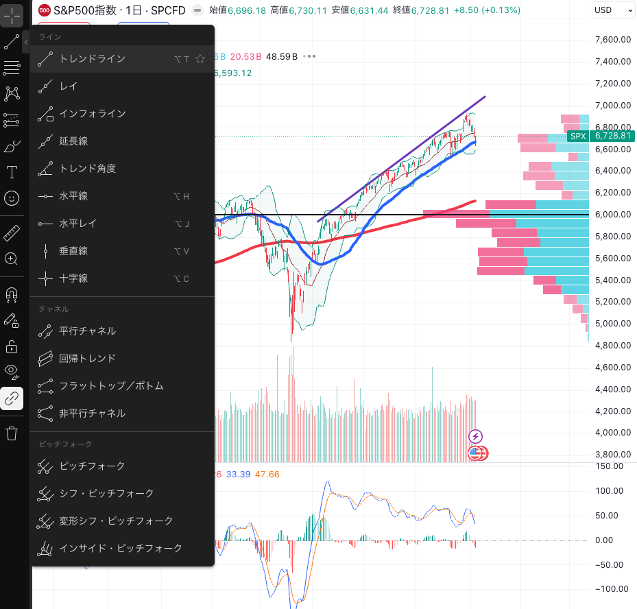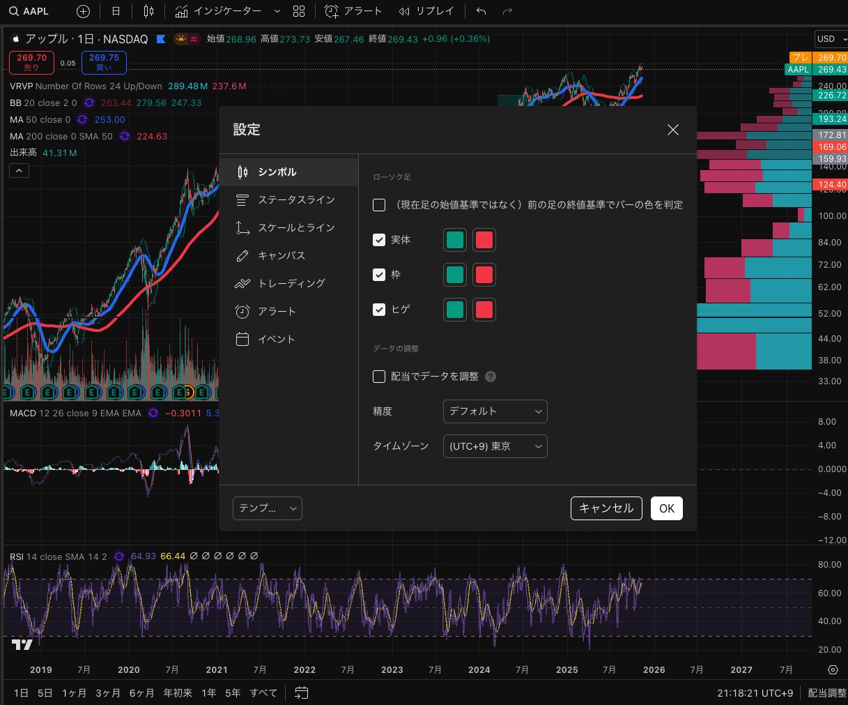 チャートの見た目(色・背景・ローソク足の太さ)、描画ツール、アラート通知の条件や方法まで、細かく設定可能です。