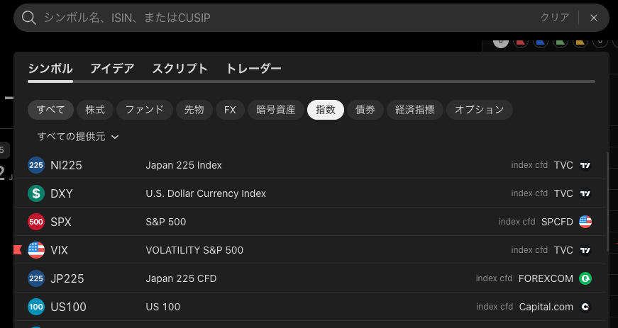 TradingViewの最大の魅力の1つは、カバーしている銘柄・市場の幅広さです。基本的に「見たいものは何でも表示できる」と言っても過言ではありません。