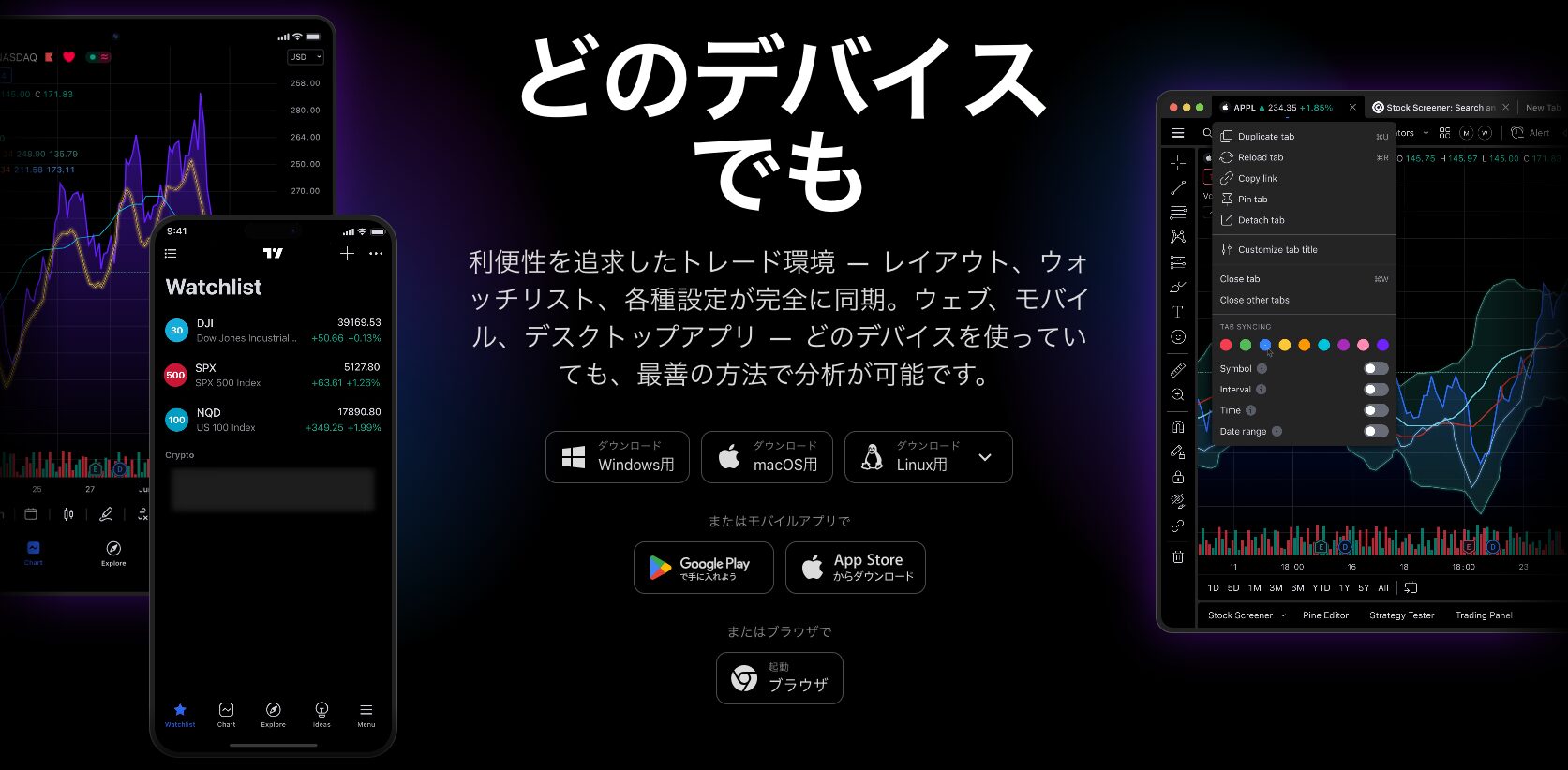 どのデバイスで開いてもレイアウトや描画、ウォッチリストが同期されるので、自宅ではPCやタブレットでじっくり分析し、外出先ではスマホでその引いた線を確認しながら市場の様子をチェックすることができます。