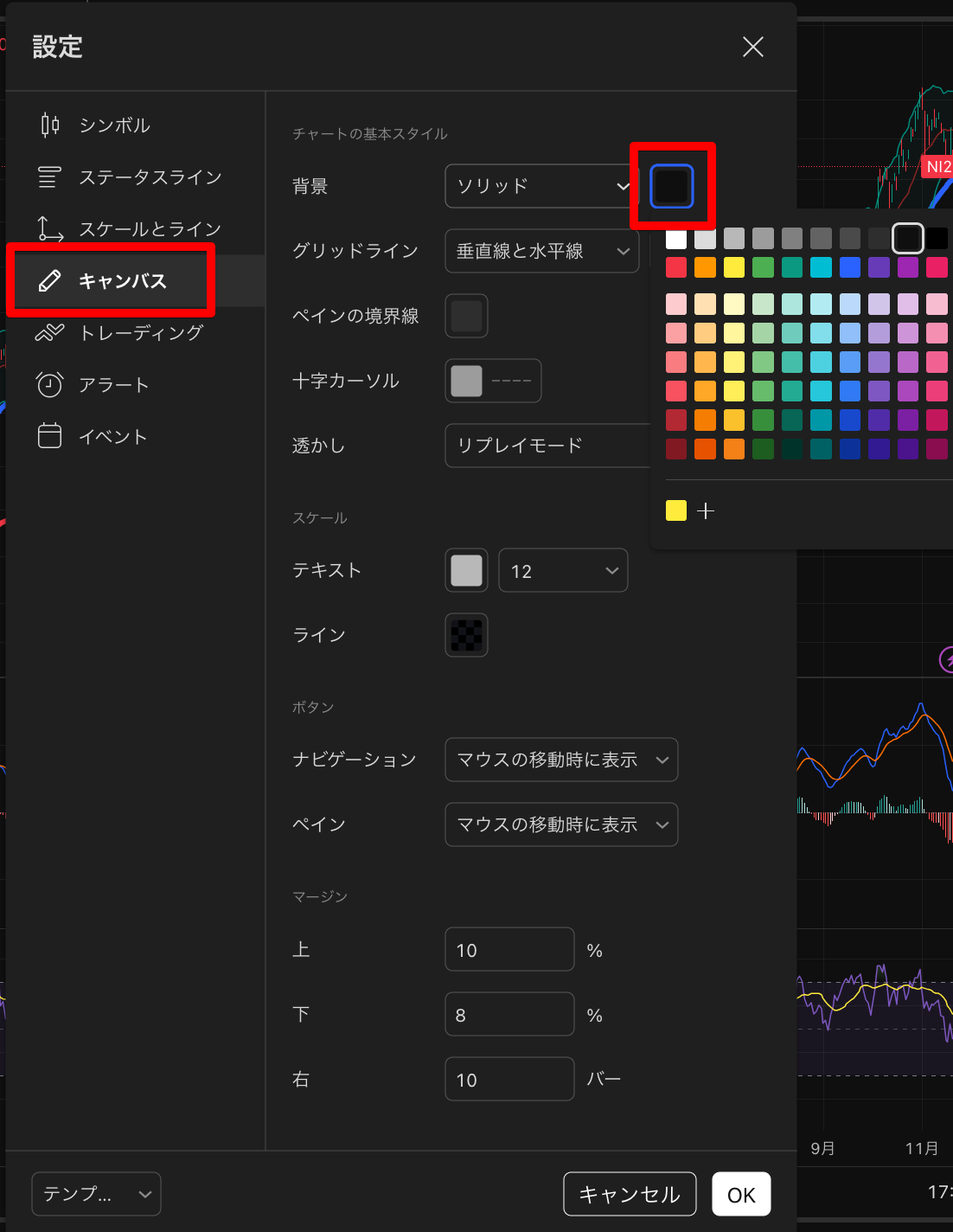 「キャンパス」タブでは、チャートの背景色を変更できます。