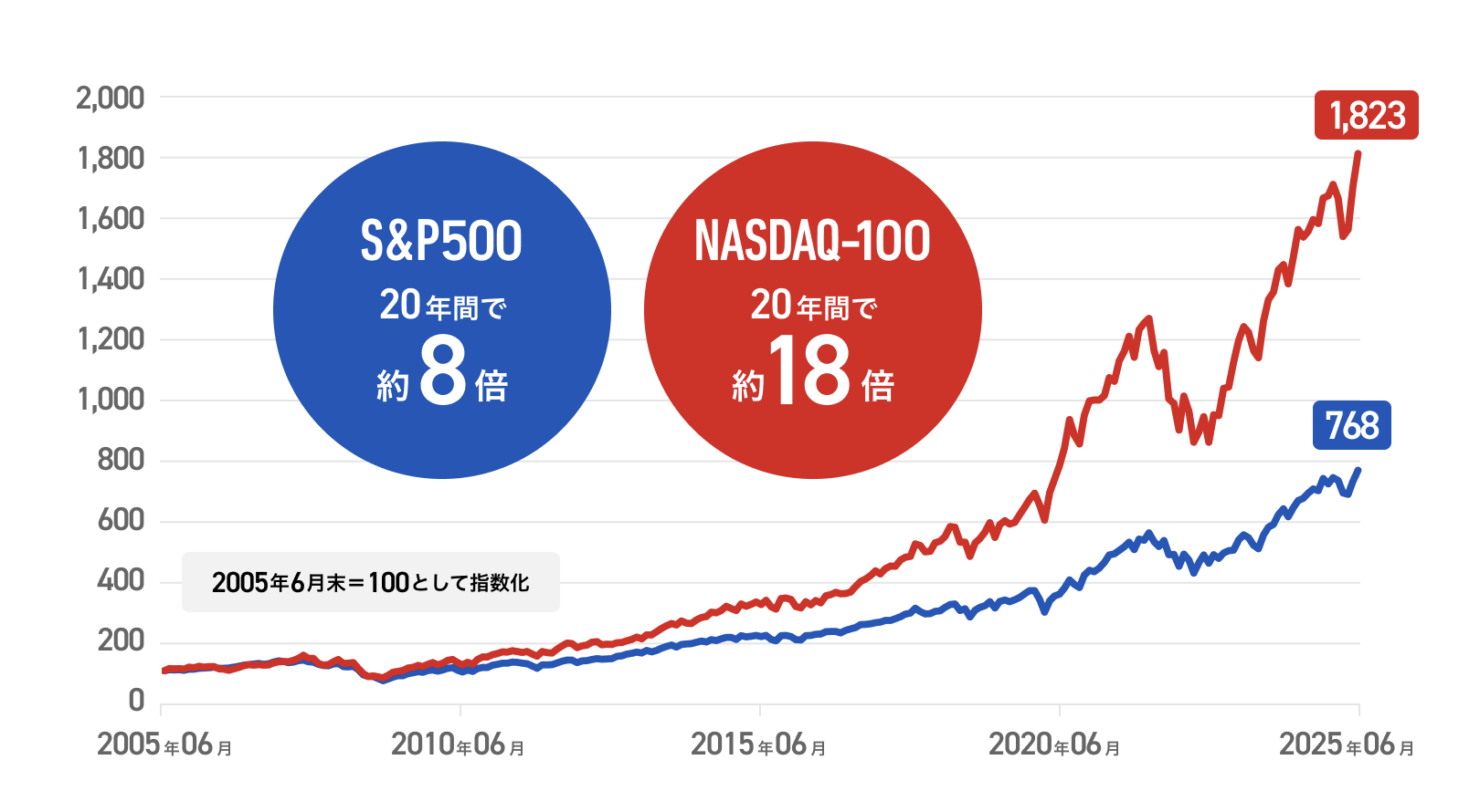 過去20年でS&P500は約8倍に上昇、NASDAQ-100はS&P500を大きく上回り約18倍という高パフォーマンスを実現してます!