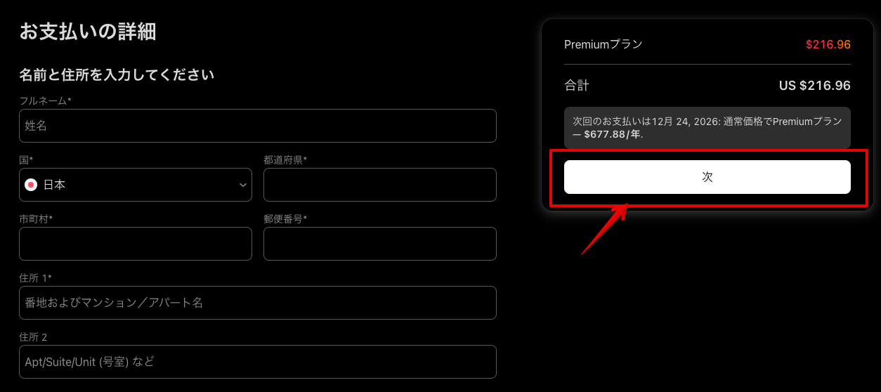 お名前と住所を入力します。日本語は対応していないので、英文字で入力しましょう!