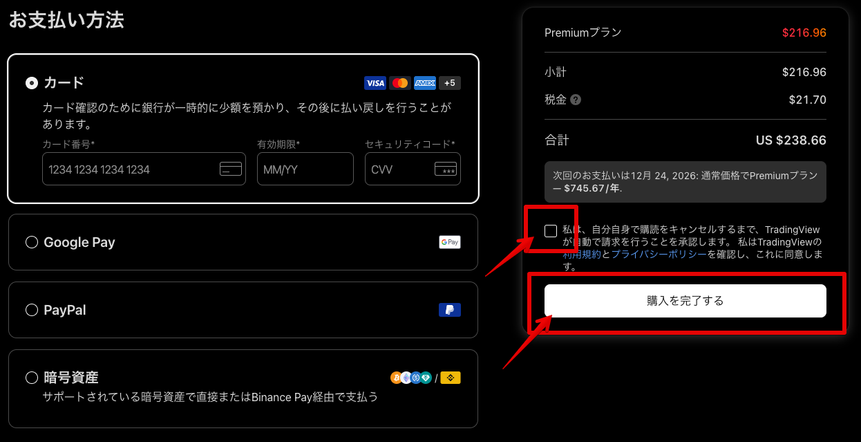 お支払い方法の入力が終わりましたら、「チェック(レ点)」を入れて、「購入を完了する」をクリックしましょう!