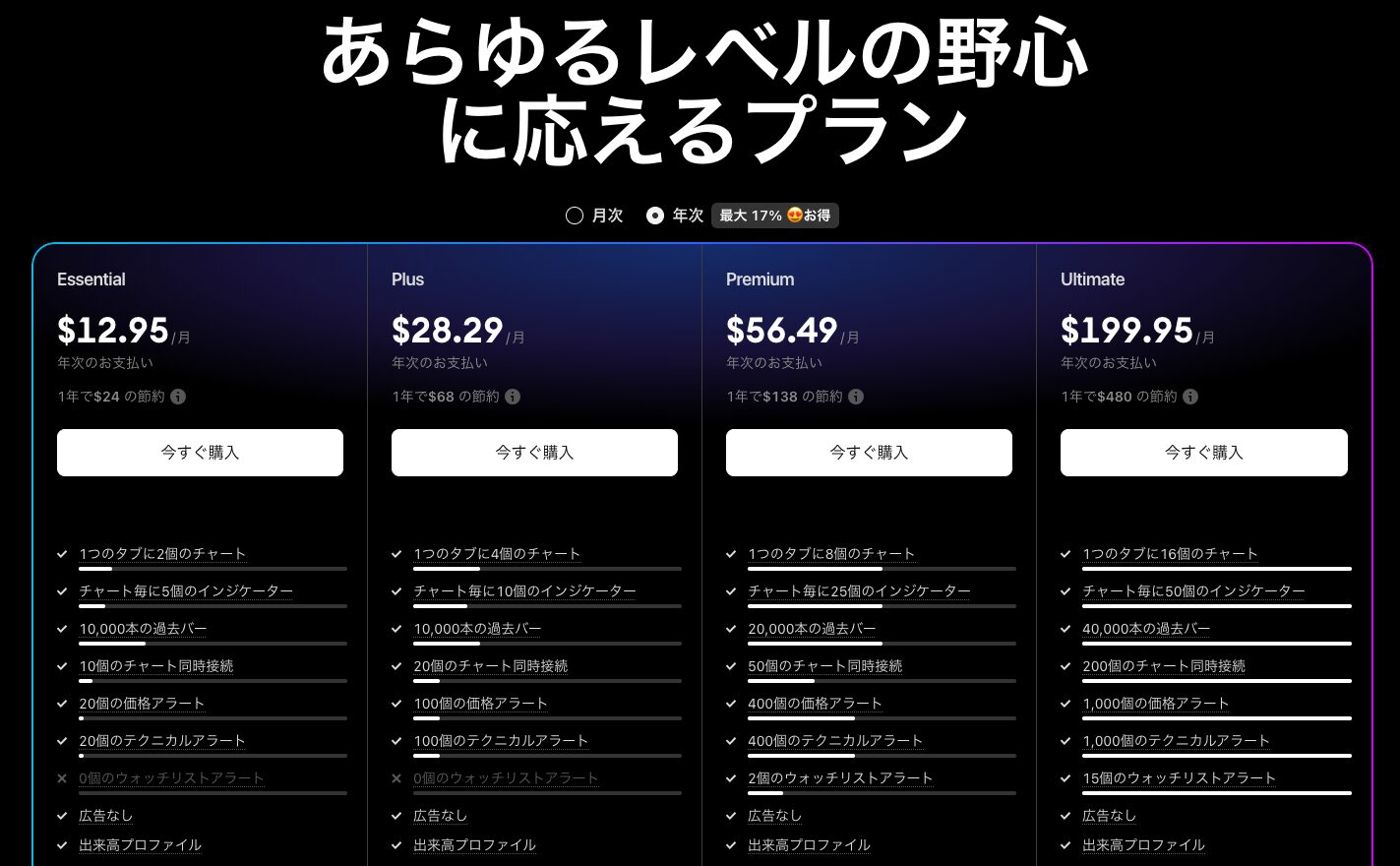 トレーディングビューの有料プランは「Essential」「Plus」「Premium」「Ultimate」の4種類です。