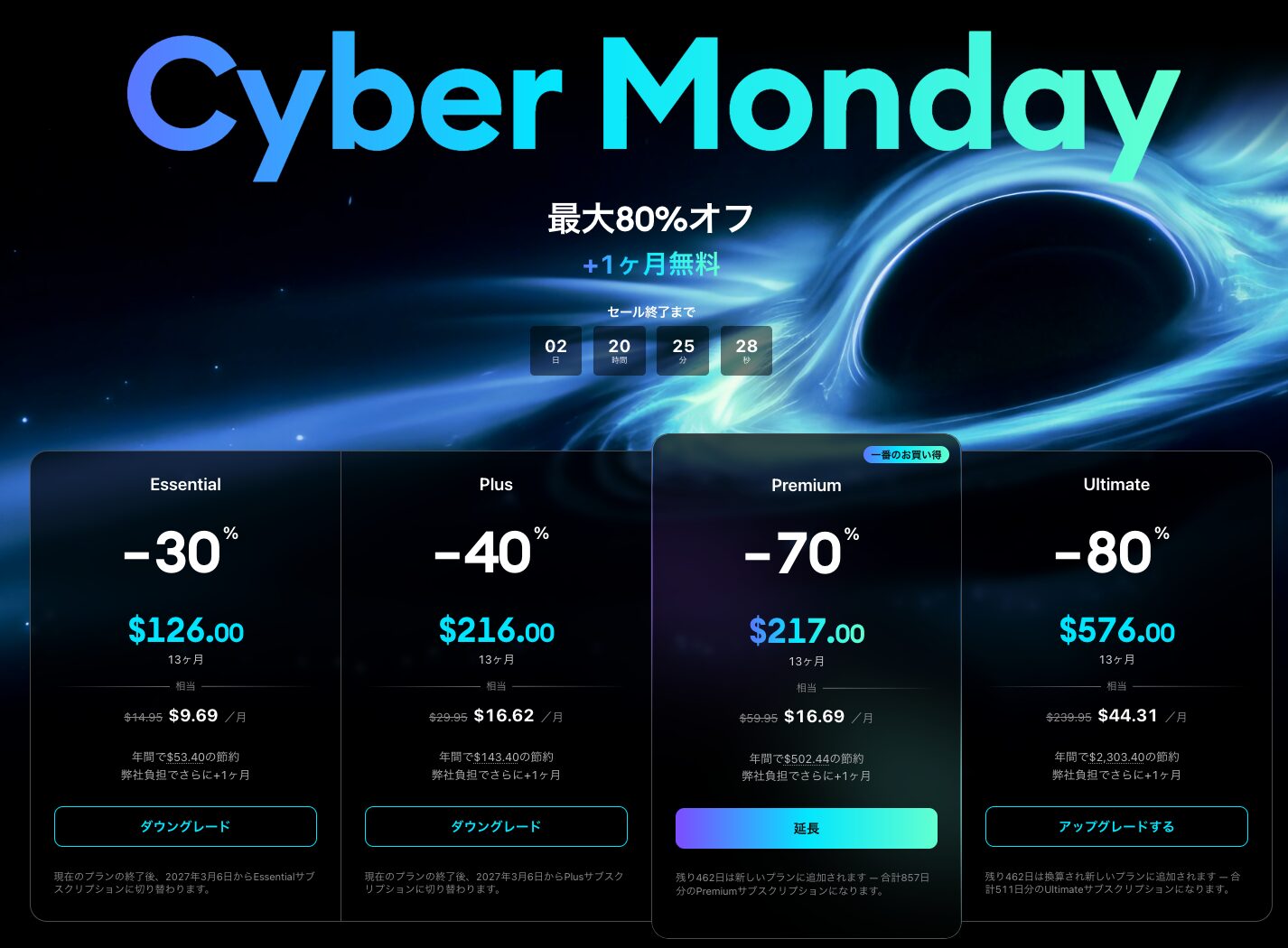 この「価格のバグ」とも言える現象は、サイバーマンデーの最大の特徴です。迷ったらPremiumを選んでおけば、機能面で後悔することはまずありません。