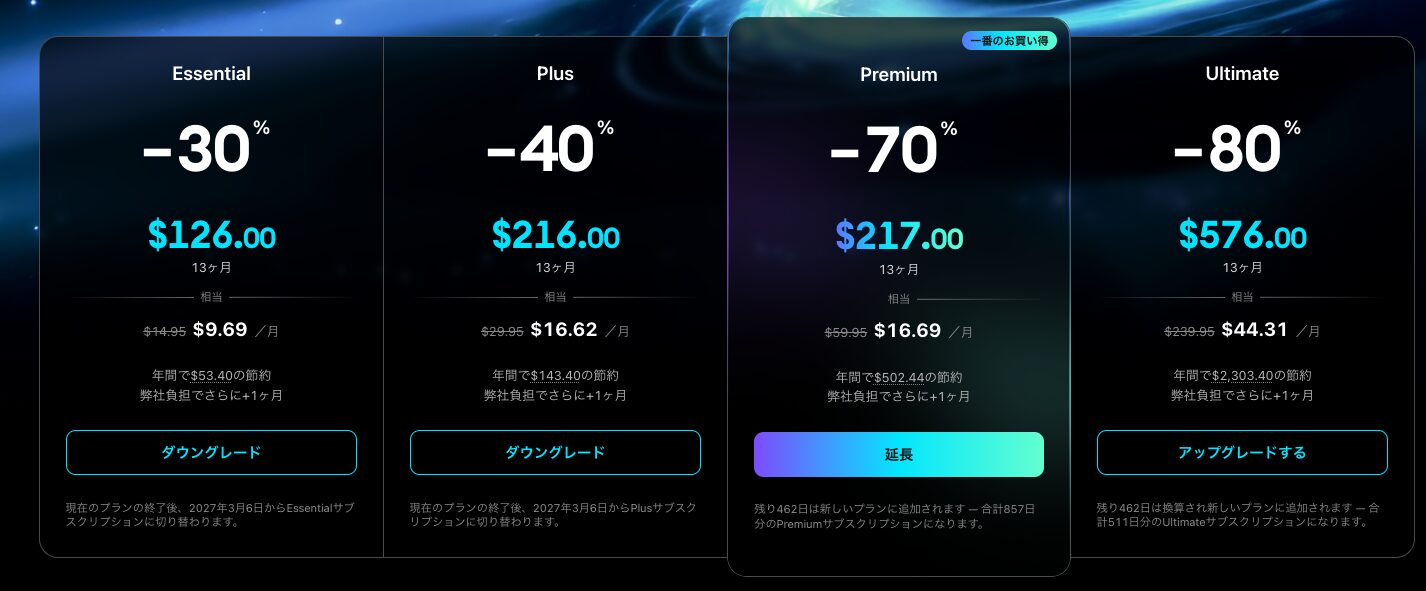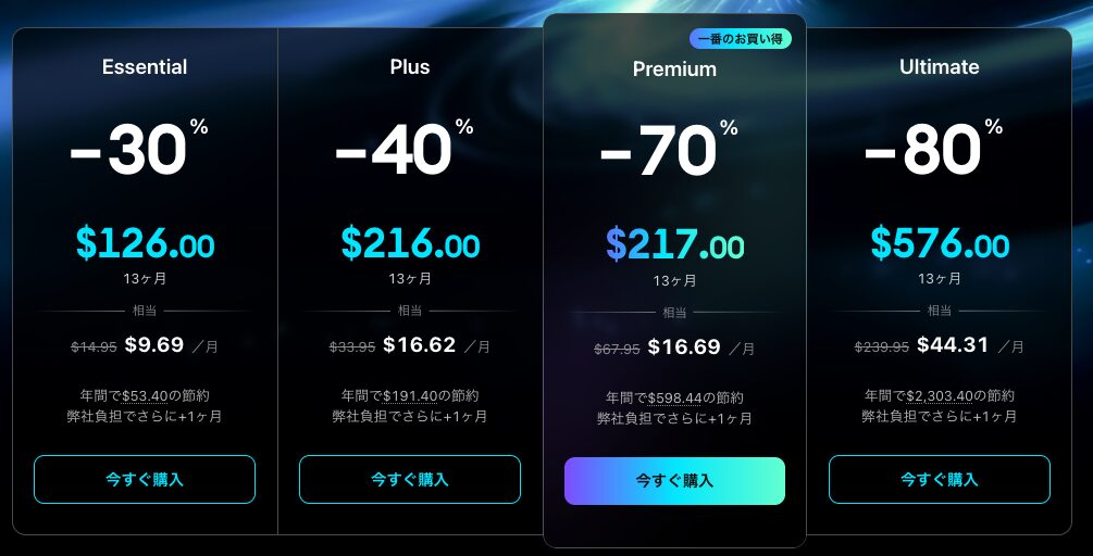 2025年の各プランの割引率は「Essential:30%割引」「Plus:40%割引」「Premium:70%割引」「Ultimate:80%割引」です。